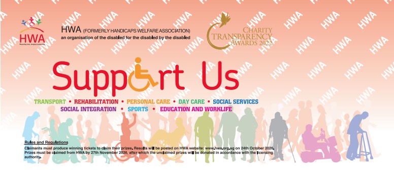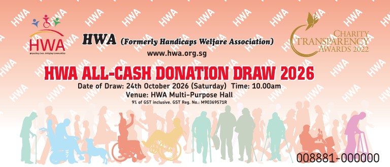 HWA seeks to create awareness of our mission in impacting the lives of persons with disabilities (PWDs). The objectives of HWA All-Cash Donation Draw 2026 are to raise funds for supporting our programmes and services such as Rehabilitation, Wheelchair Accessible Transport, Home Care Services & Senior Day Care Centre, for our beneficiaries and the elderly.